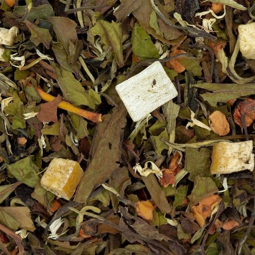 Thé blanc Pai Mu Tan, morceaux de pomme, cubes de pomelo (écorce de pomelo, sucre, acidifiant : acide citrique), arôme naturel, Aloe Vera confit (Aloe Vera, sucre), baies de sureau, arilles de grenade, fleurs de bleuet.