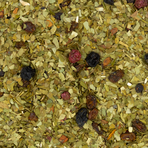 Maté vert (72%), cassis, baie d’argousier, myrtille, morceaux de cannelle, arôme, groseille lyophilisé.