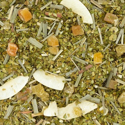 Maté vert, cubes de papaye (papaye, sucre), cubes d’ananas (ananas, sucre), citronnelle, noix de coco râpée, copeaux de noix de coco, arôme naturel.