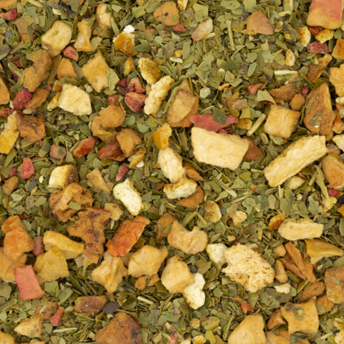 Maté, morceaux de pomme, cubes de pomme, écorce d’orange, arôme naturel, écorce de citron lyophilisée, morceaux de framboise lyophilisés.