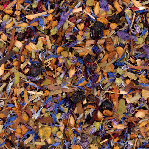 Morceaux de pomme, MALT D’ORGE, hibiscus, lapacho, fleurs de lavande, fleurs de tilleul, fleurs de mauve, citronnelle, myrtilles, fleurs de bleuet, arôme naturel.